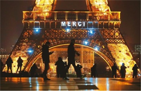 3月27日晚,埃菲爾鐵塔亮燈並打出法語“感謝”字樣。