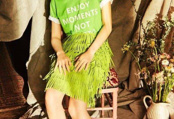 宋祖兒時尚大片來襲,她穿一件綠色的短袖,上面印着白色的英文字符,透出小清新的風格。她在下面搭配一條綠色的流蘇半裙,造型很是獨特亮眼。她腳踩一雙金色的松糕鞋,顯出少女感!