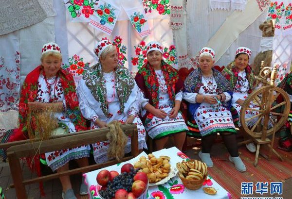 9月26日,在白俄羅斯首都明斯克郊區,人們身着民族服飾參加農業展銷節。 隨着當地秋收的基本結束,白俄羅斯各地相繼舉辦農業展銷節等活動,歡慶秋收。 新華社發(任科夫攝)